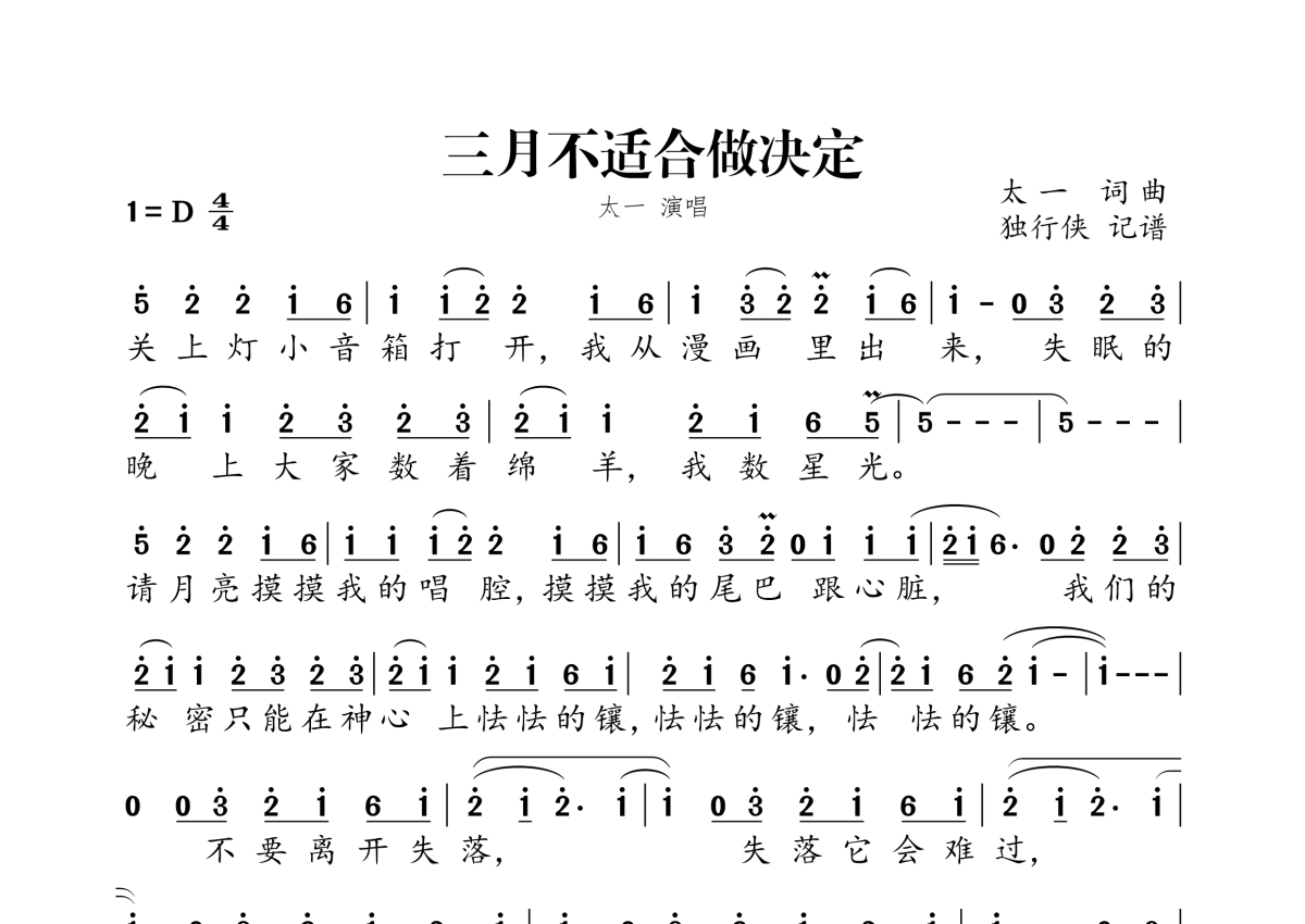 《三月不适合做决定》是太一演唱的一首歌曲,拍号为4/4拍,这份简谱共有三张高清图谱,图谱由 @独行侠 编配上传。
