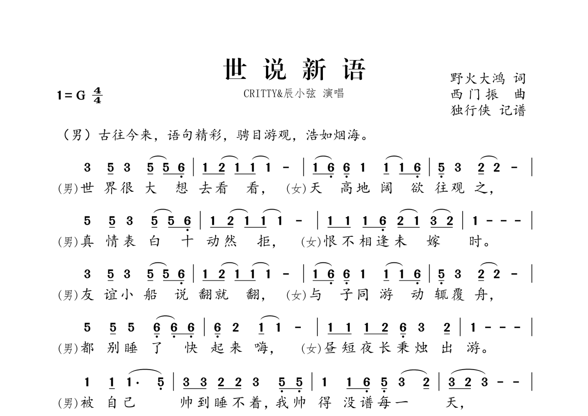 《世说新语》是CRITTY&辰小弦演唱的一首歌曲,拍号为4/4拍,这份简谱共有两张高清图谱,图谱由 @独行侠 编配上传。