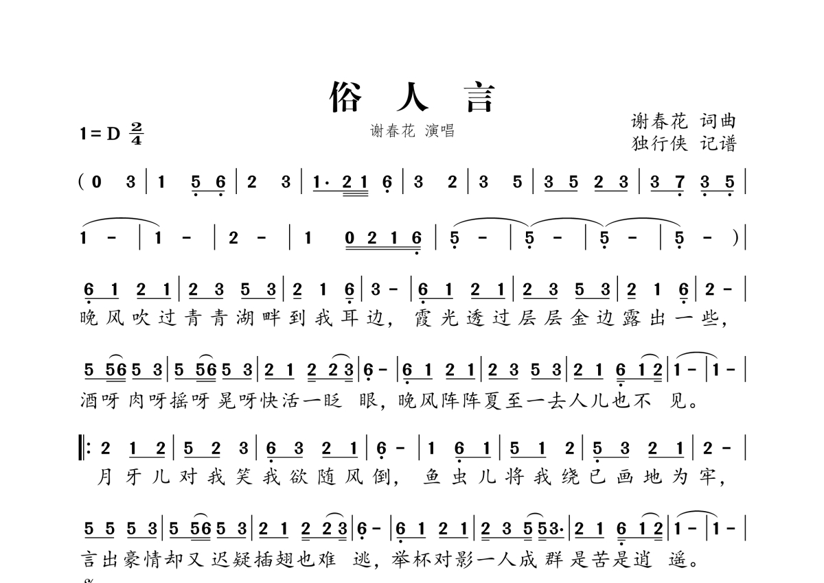 《俗人言》是谢春花演唱的一首歌曲,拍号为2/4拍,这份简谱共有一张高清图谱,图谱由 @独行侠 编配上传。