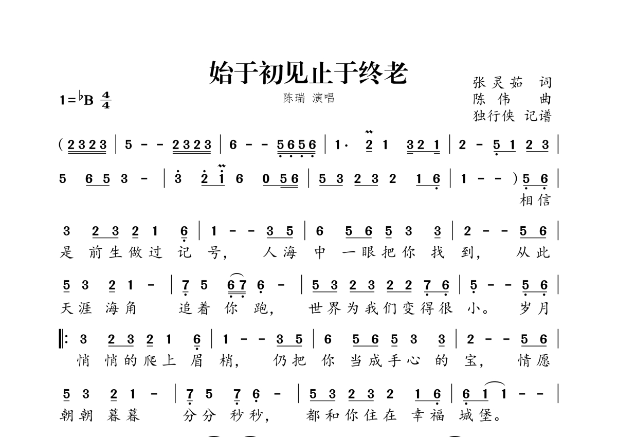 《始于初见止于终老》是陈瑞演唱的一首歌曲,拍号为4/4拍,这份简谱共有一张高清图谱,图谱由 @独行侠 编配上传。