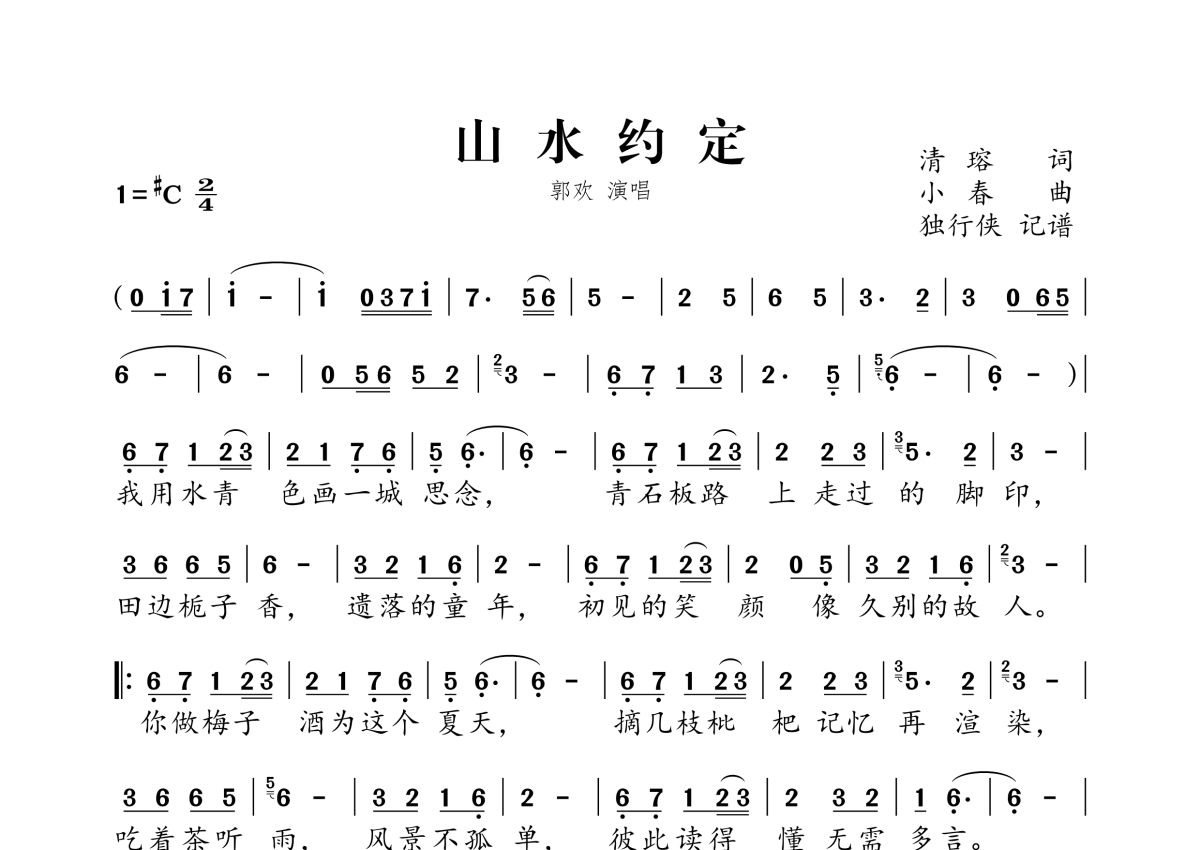 《山水约定》是郭欢演唱的一首歌曲,拍号为2/4拍,这份简谱共有一张高清图谱,图谱由 @独行侠 编配上传。