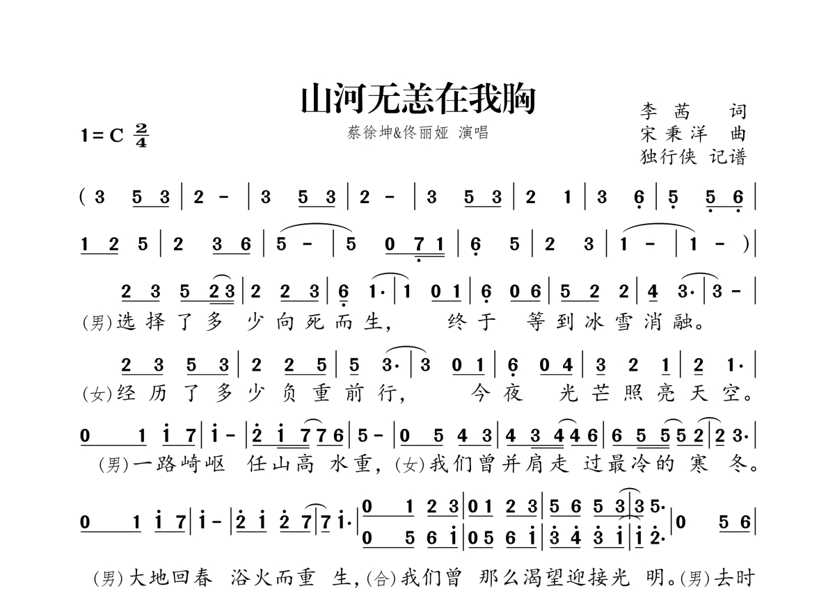 蔡徐坤&佟丽娅《山河无恙在我胸》简谱