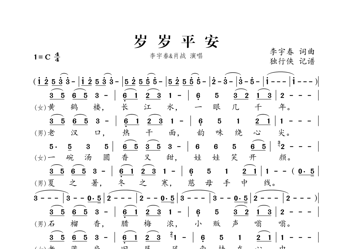 《岁岁平安》是李宇春&肖战演唱的一首歌曲,拍号为4/4拍,这份简谱共有一张高清图谱,图谱由 @独行侠 编配上传。