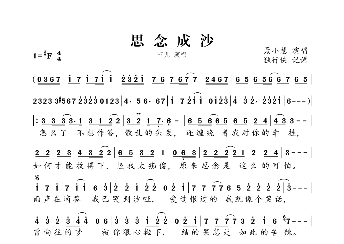 《思念成沙》是菲儿演唱的一首歌曲,女声,拍号为4/4拍,这份简谱共有一张高清图谱,图谱由 @独行侠 编配上传。