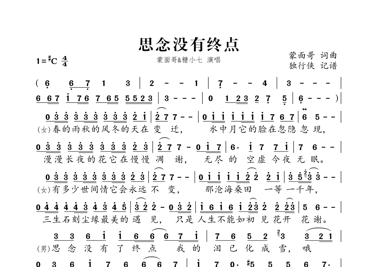 蒙面哥&糖小七《思念没有终点》简谱