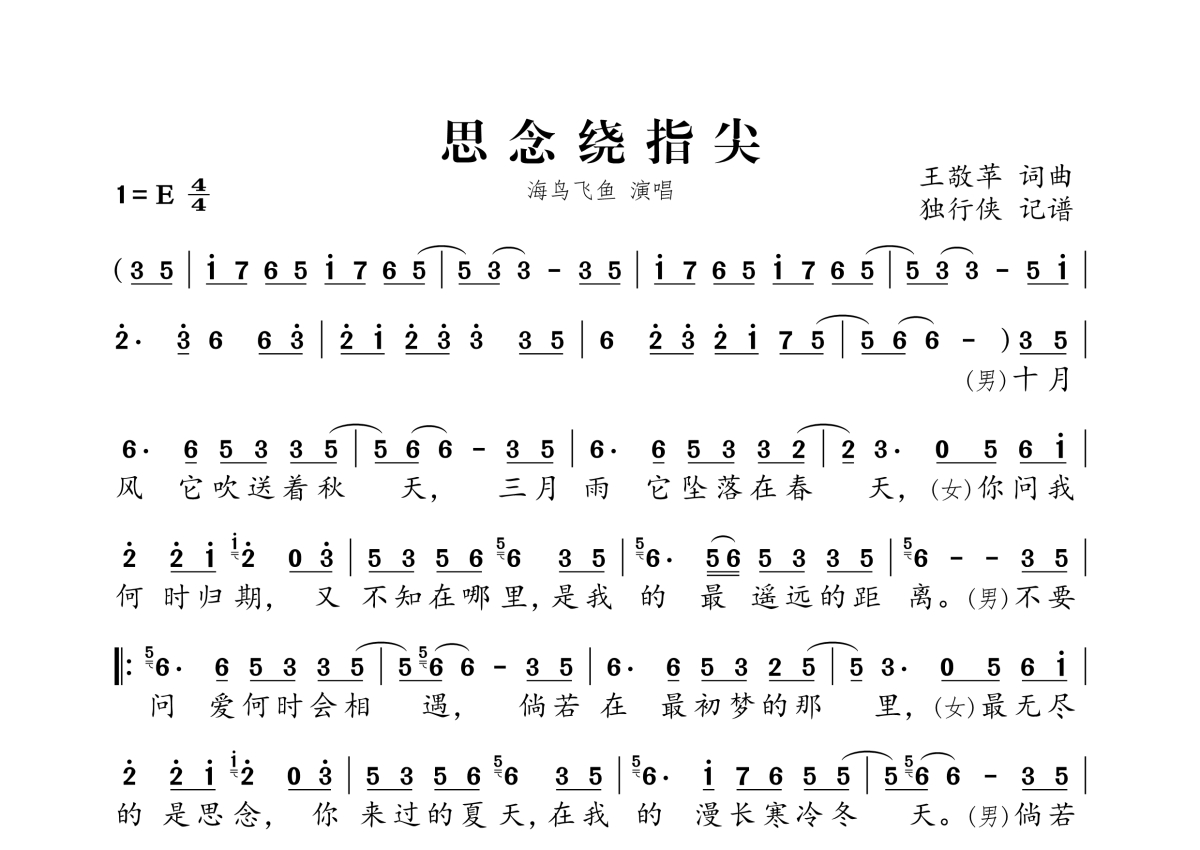 《思念绕指尖》是海鸟飞鱼演唱的一首歌曲,拍号为4/4拍,这份简谱共有一张高清图谱,图谱由 @独行侠 编配上传。