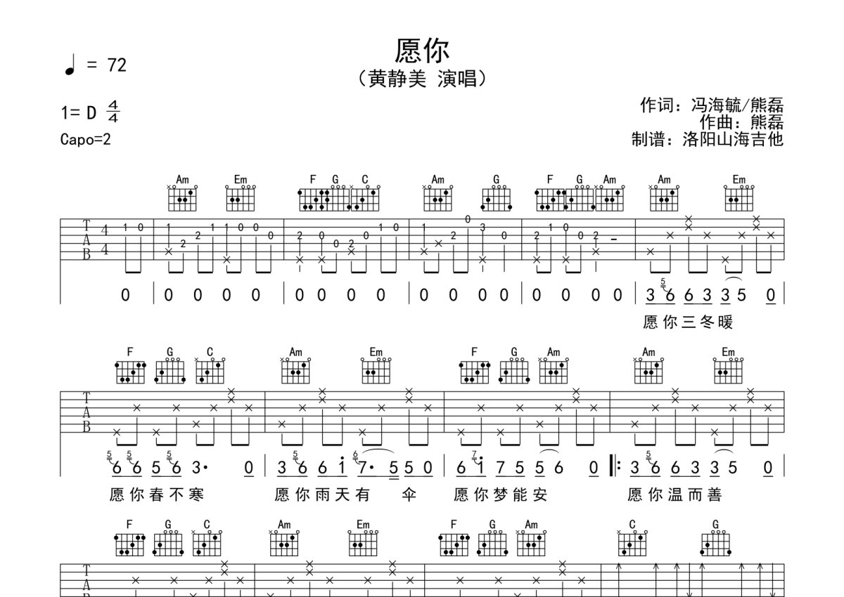 黄静美《愿你》吉他谱 - C调弹唱六线谱