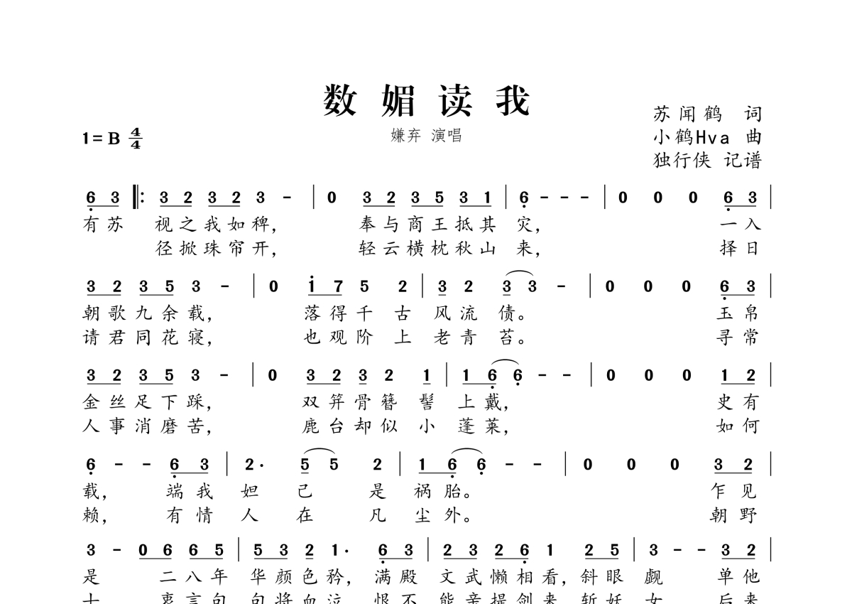 《数媚读我》是嫌弃演唱的一首歌曲,拍号为4/4拍,这份简谱共有一张高清图谱,图谱由 @独行侠 编配上传。