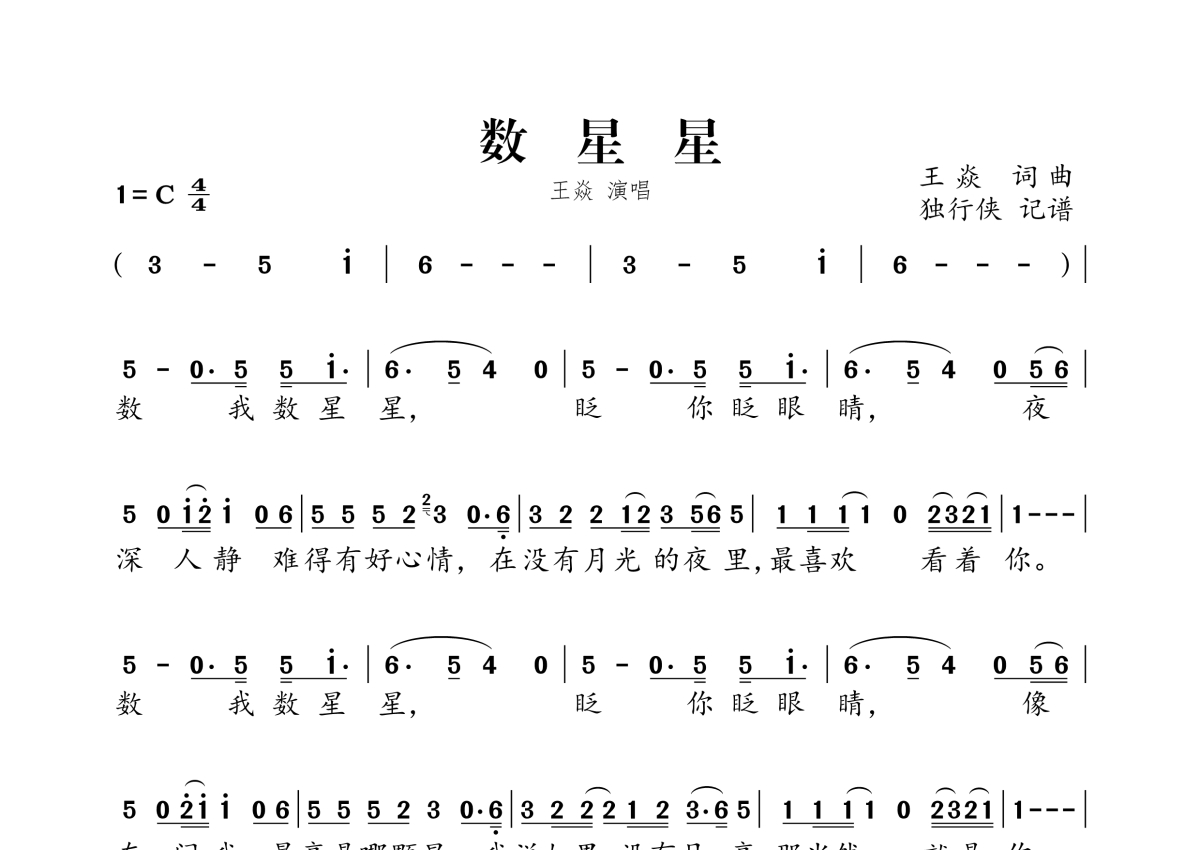 《数星星》是王焱演唱的一首歌曲,拍号为4/4拍,这份简谱共有两张高清图谱,图谱由 @独行侠 编配上传。