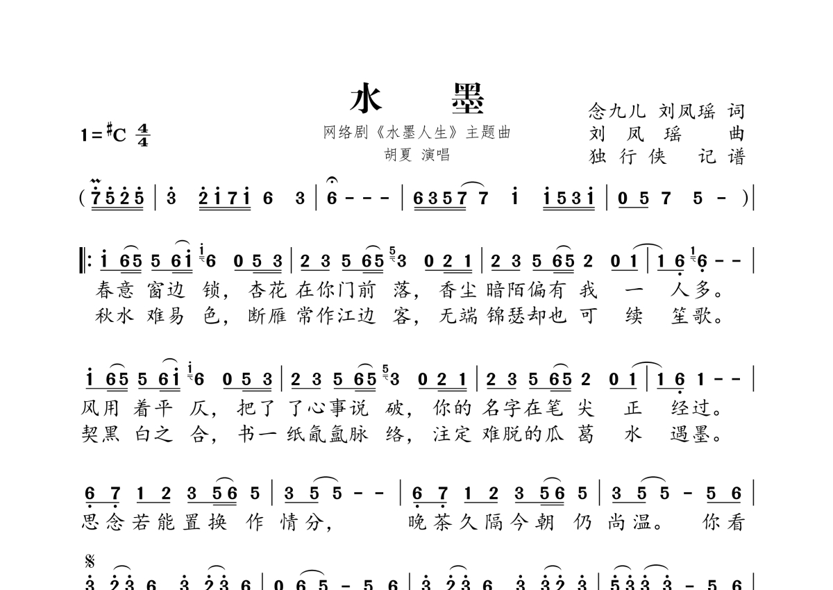 《水墨》是胡夏演唱的一首歌曲,拍号为4/4拍,这份简谱共有一张高清图谱,图谱由 @独行侠 编配上传。