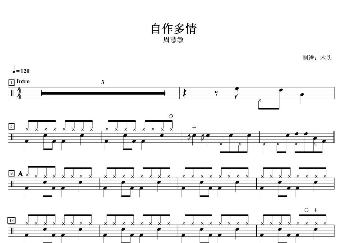 《自作多情》是周慧敏演唱的一首歌曲,这份鼓谱共有五张高清图谱,图谱由 @打鼓谱 编配上传,图谱使用五线谱编配,使用这份自作多情架子鼓谱,你将能够轻松地敲打出这首周慧敏的自作多情,快来尝试吧。歌曲名:自作多情,歌手名:周慧敏,专辑名:冬日浪漫。