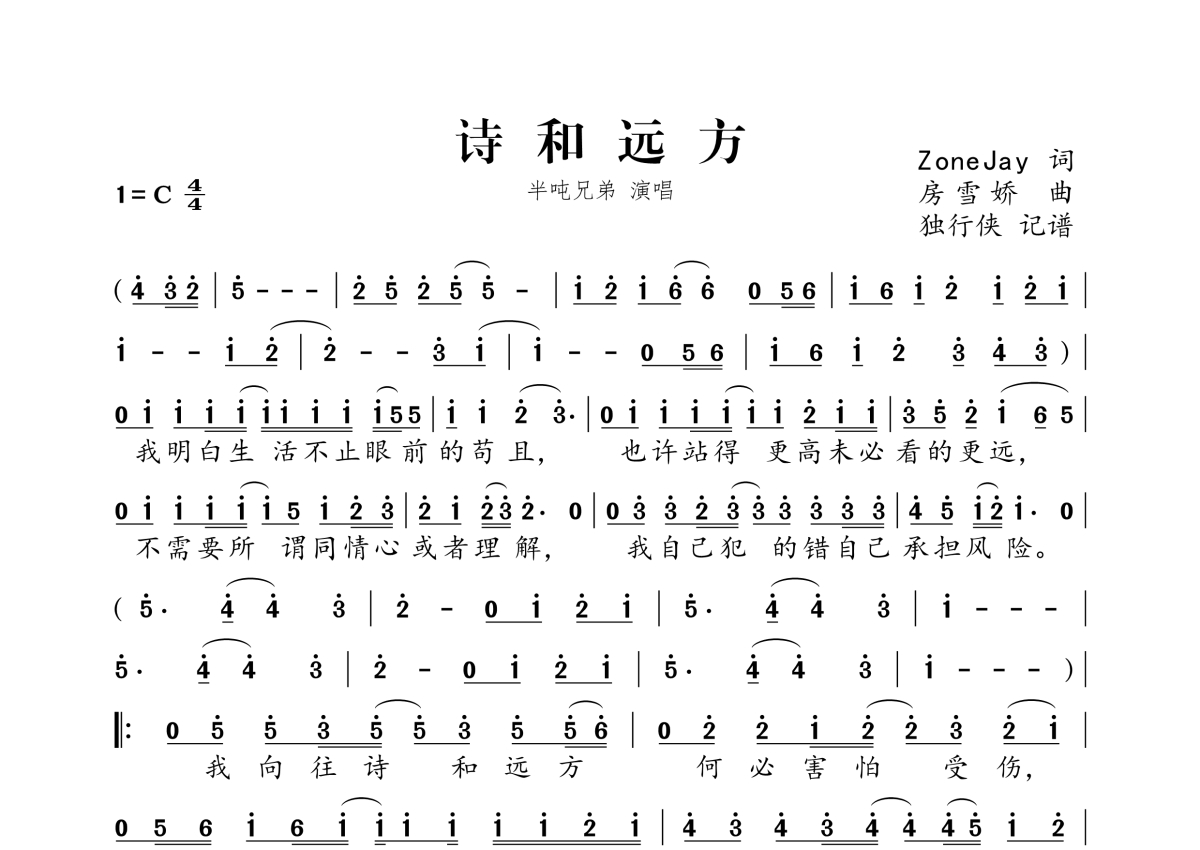 《诗和远方》是半吨兄弟演唱的一首歌曲,拍号为4/4拍,这份简谱共有一张高清图谱,图谱由 @独行侠 编配上传。
