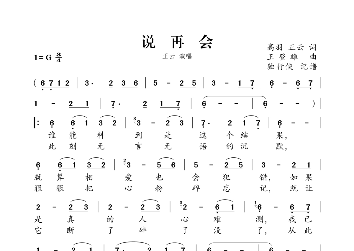 《说再会》是正云演唱的一首歌曲,拍号为3/4拍,这份简谱共有一张高清图谱,图谱由 @独行侠 编配上传。