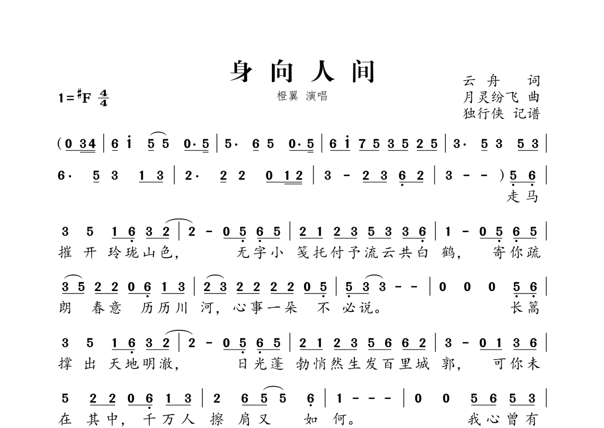 《身向人间》是橙翼演唱的一首歌曲,拍号为4/4拍,这份简谱共有两张高清图谱,图谱由 @独行侠 编配上传。