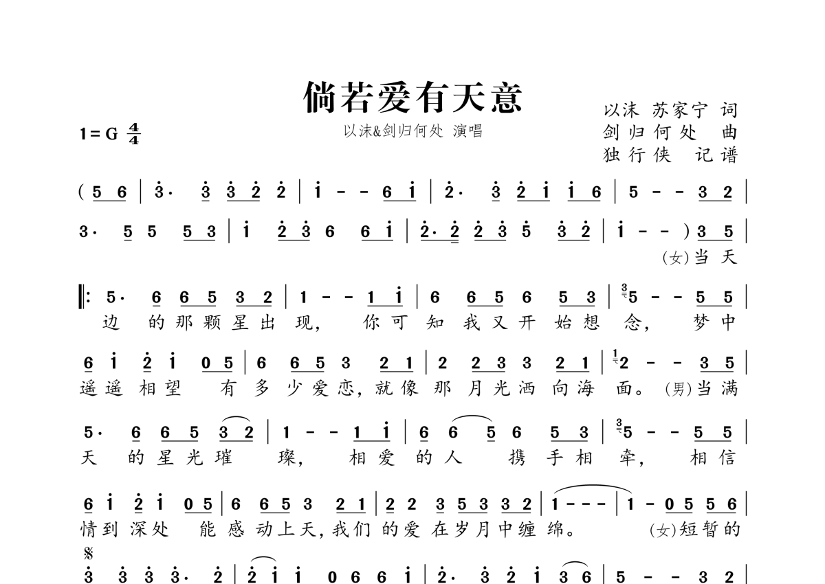《倘若爱有天意》是以沫、剑归何处演唱的一首歌曲,拍号为4/4拍,这份简谱共有一张高清图谱,图谱由 @独行侠 编配上传。