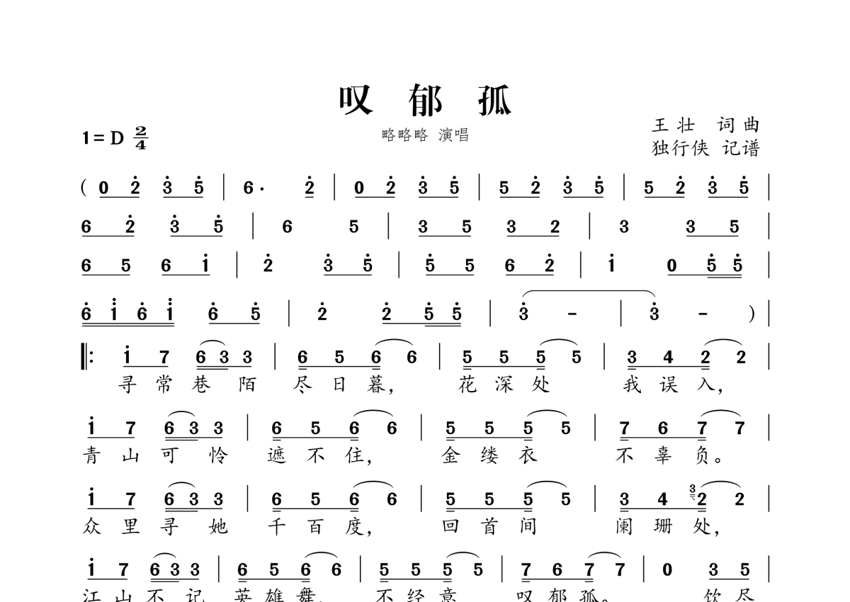 《叹郁孤》是略略略演唱的一首歌曲,拍号为2/4拍,这份简谱共有一张高清图谱,图谱由 @独行侠 编配上传。