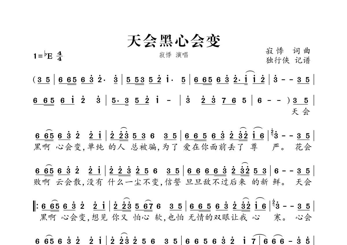 《天会黑心会变》是寂悸演唱的一首歌曲,拍号为4/4拍,这份简谱共有一张高清图谱,图谱由 @独行侠 编配上传。