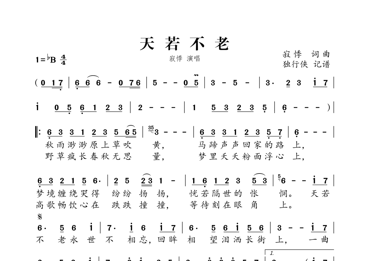 《天若不老》是寂悸演唱的一首歌曲,拍号为4/4拍,这份简谱共有一张高清图谱,图谱由 @独行侠 编配上传。