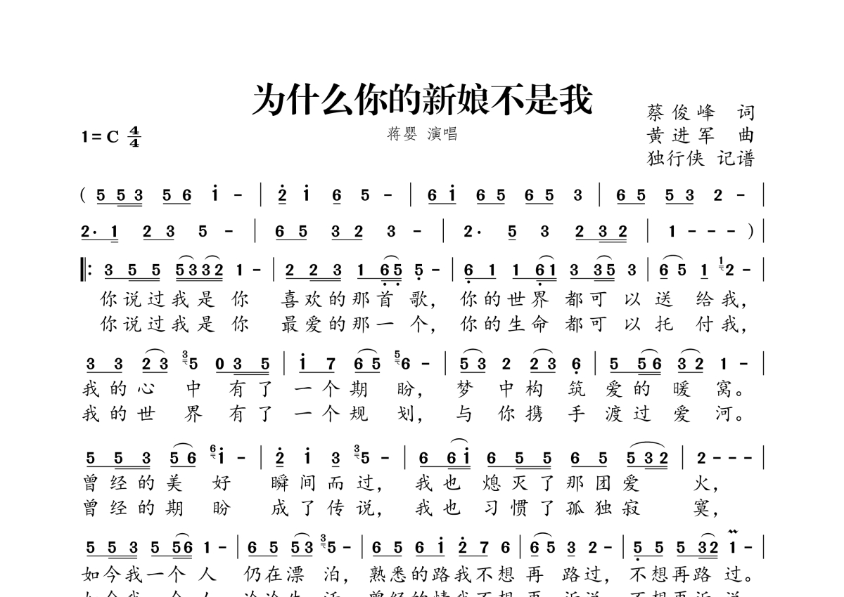 《为什么你的新娘不是我》是蒋婴演唱的一首歌曲,拍号为4/4拍,这份简谱共有一张高清图谱,图谱由 @独行侠 编配上传。