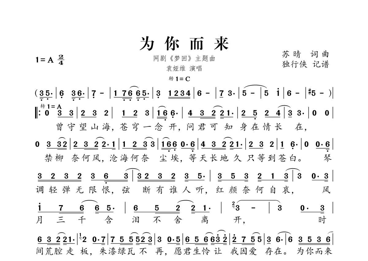 《为你而来》是袁娅维TIA RAY演唱的一首歌曲,拍号为2/4拍,这份简谱共有一张高清图谱,图谱由 @独行侠 编配上传。