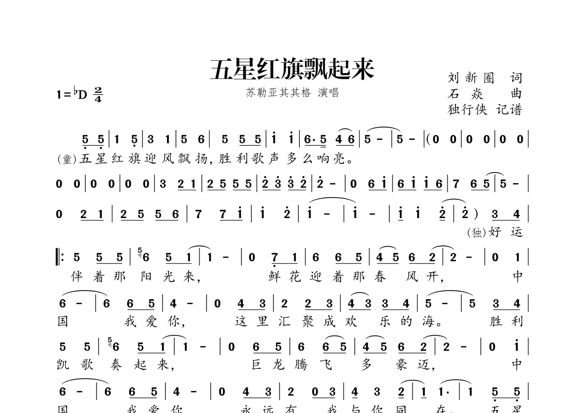 《五星红旗飘起来》是苏勒亚其其格演唱的一首歌曲,拍号为2/4拍,这份简谱共有一张高清图谱,图谱由 @独行侠 编配上传。