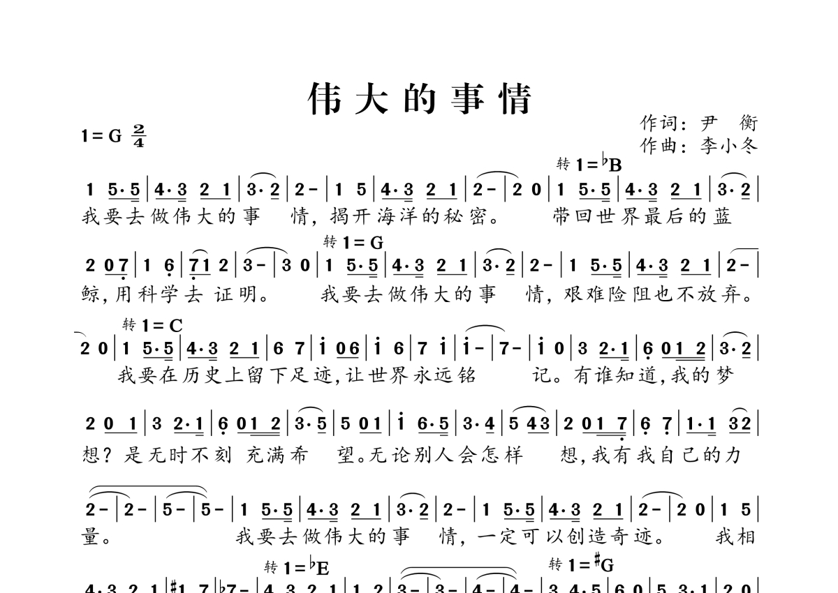 《伟大的事情》,拍号为2/4拍,这份简谱共有一张高清图谱,图谱由 @独行侠 编配上传。
