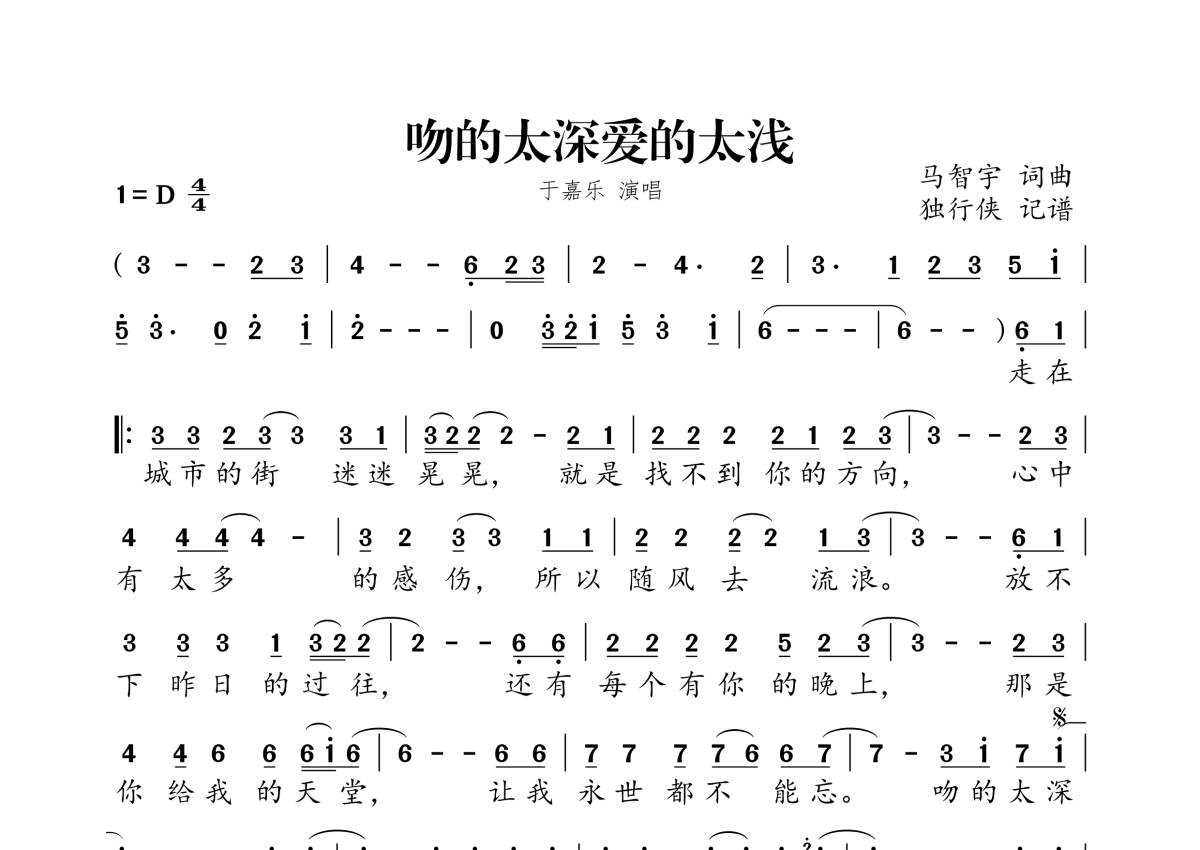 《吻的太深爱的太浅》是于嘉乐演唱的一首歌曲,拍号为4/4拍,这份简谱共有一张高清图谱,图谱由 @独行侠 编配上传。