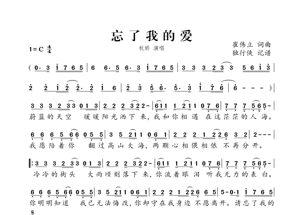 《忘了我的爱》是杭娇演唱的一首歌曲,拍号为4/4拍,这份简谱共有一张高清图谱,图谱由 @独行侠 编配上传。