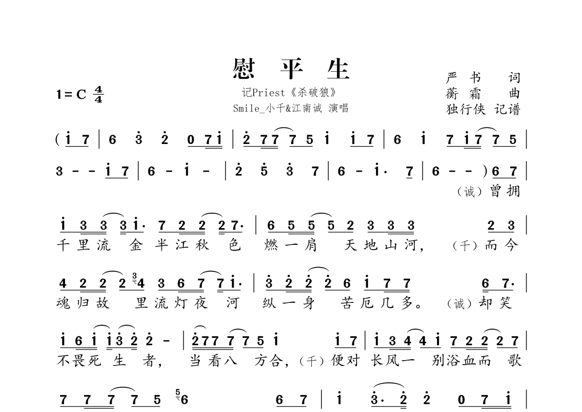 《慰平生》是Smile-小千、江楠诚演唱的一首歌曲,拍号为4/4拍,这份简谱共有两张高清图谱,图谱由 @独行侠 编配上传。