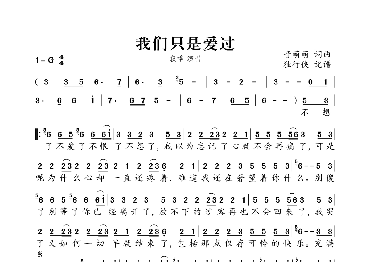 《我们只是爱过》是寂悸演唱的一首歌曲,拍号为4/4拍,这份简谱共有一张高清图谱,图谱由 @独行侠 编配上传。