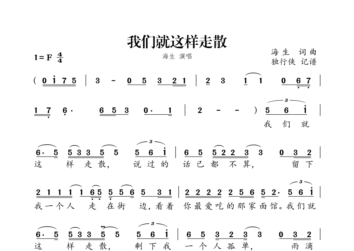 《我们就这样走散》是海生演唱的一首歌曲,拍号为4/4拍,这份简谱共有两张高清图谱,图谱由 @独行侠 编配上传。