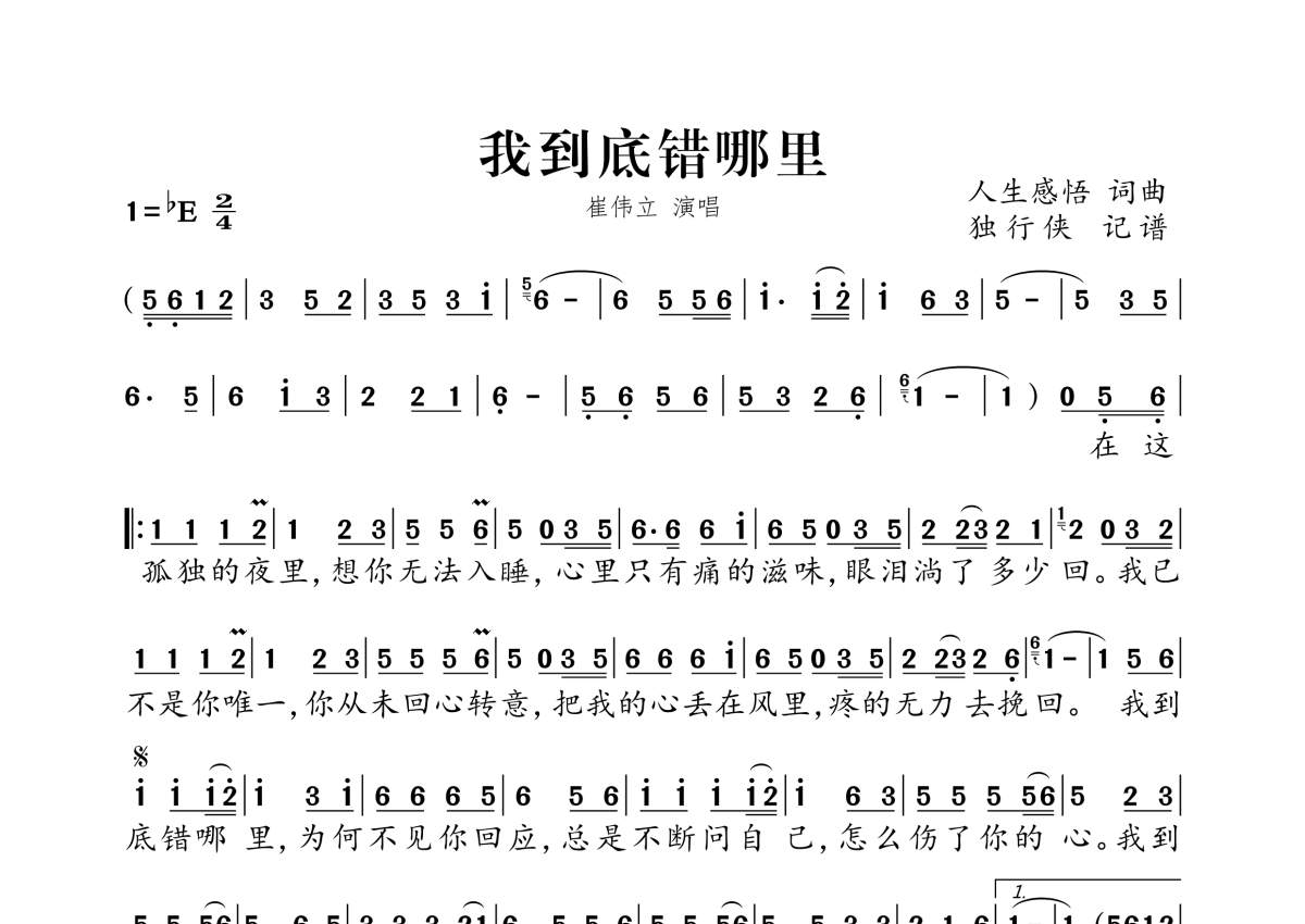 《我到底错哪里》是崔伟立演唱的一首歌曲,拍号为2/4拍,这份简谱共有一张高清图谱,图谱由 @独行侠 编配上传。