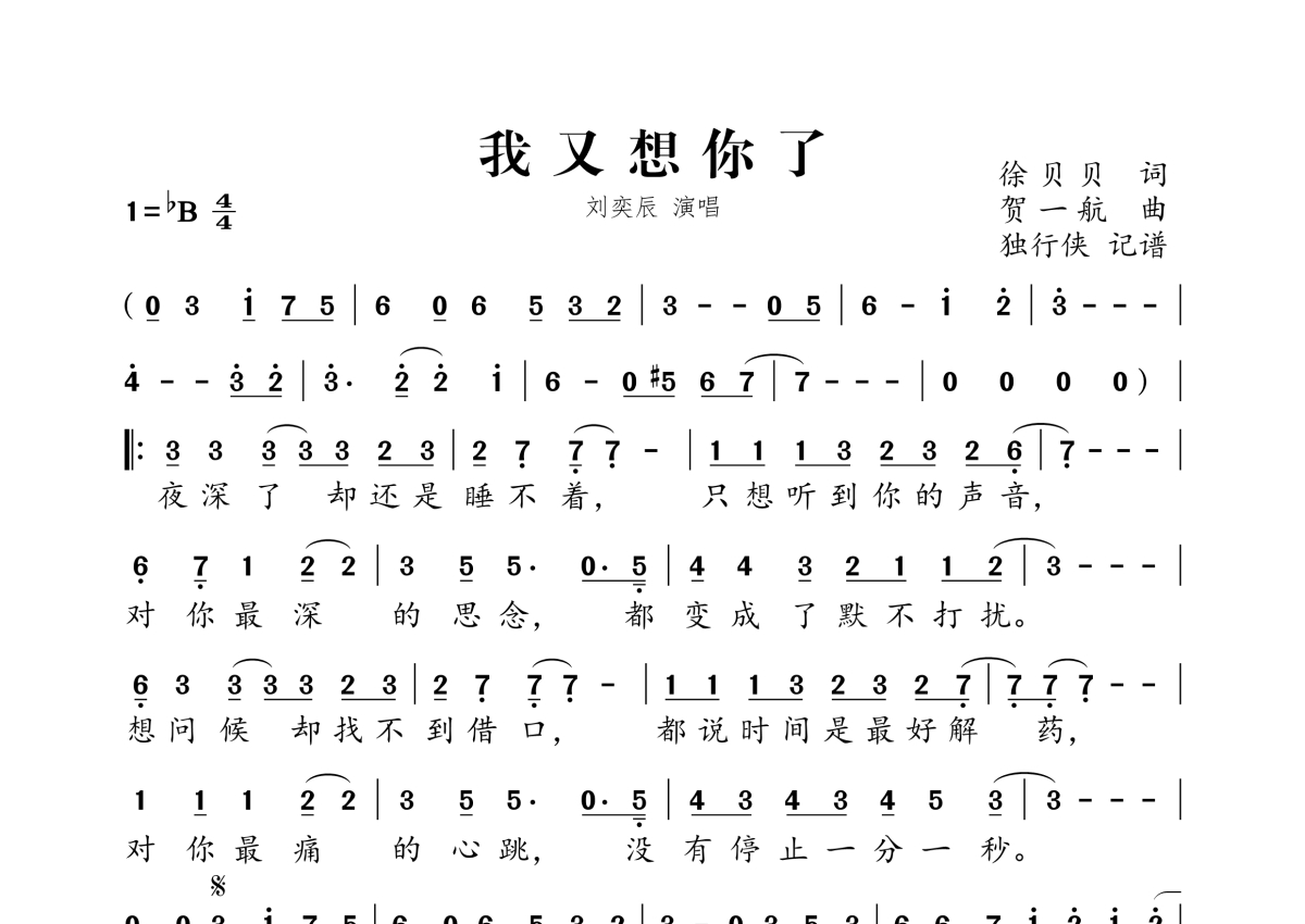 《我又想你了》是刘亦辰演唱的一首歌曲,拍号为4/4拍,这份简谱共有一张高清图谱,图谱由 @独行侠 编配上传。