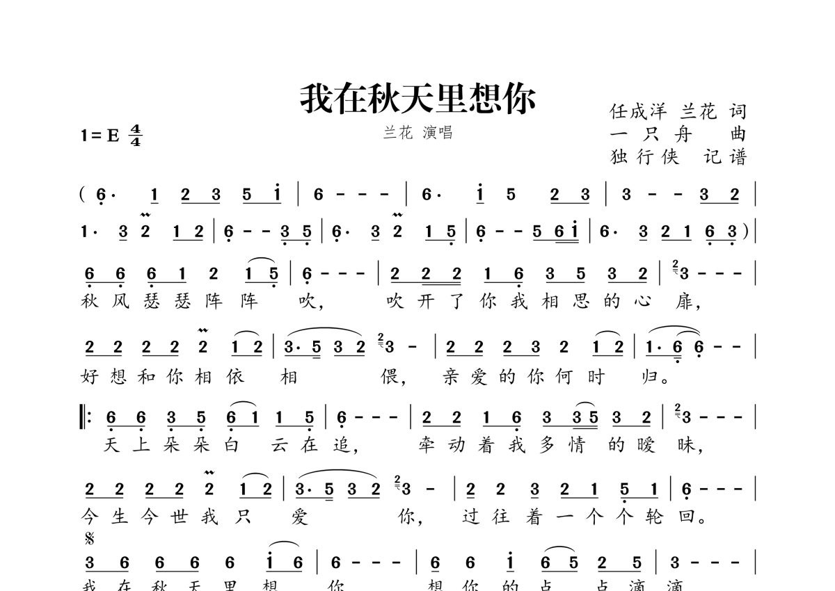 《我在秋天里想你》是兰花演唱的一首歌曲,拍号为4/4拍,这份简谱共有一张高清图谱,图谱由 @独行侠 编配上传。