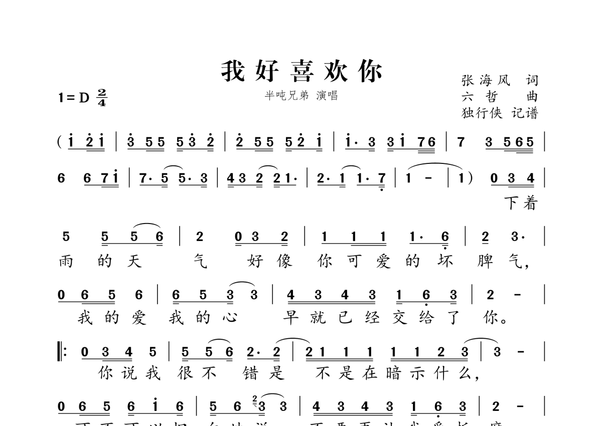 《我好喜欢你》是半吨兄弟演唱的一首歌曲,拍号为2/4拍,这份简谱共有两张高清图谱,图谱由 @独行侠 编配上传。