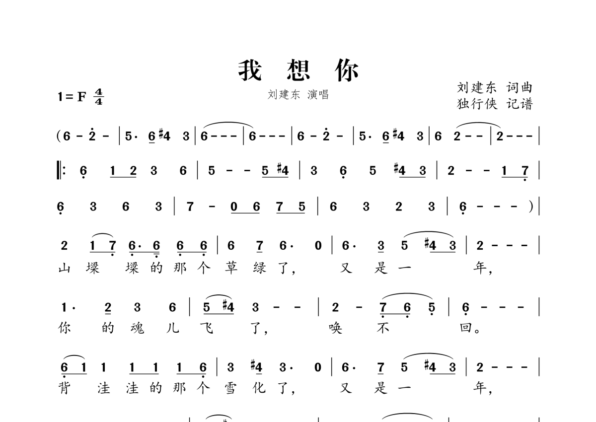 《我想你》是刘建东演唱的一首歌曲,拍号为4/4拍,这份简谱共有一张高清图谱,图谱由 @独行侠 编配上传。