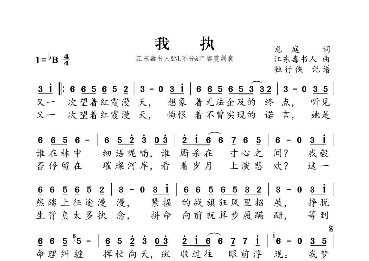 《我执》是江东毒书人、NL不分&阿睿凌霓剑裳演唱的一首歌曲,拍号为4/4拍,这份简谱共有两张高清图谱,图谱由 @独行侠 编配上传。
