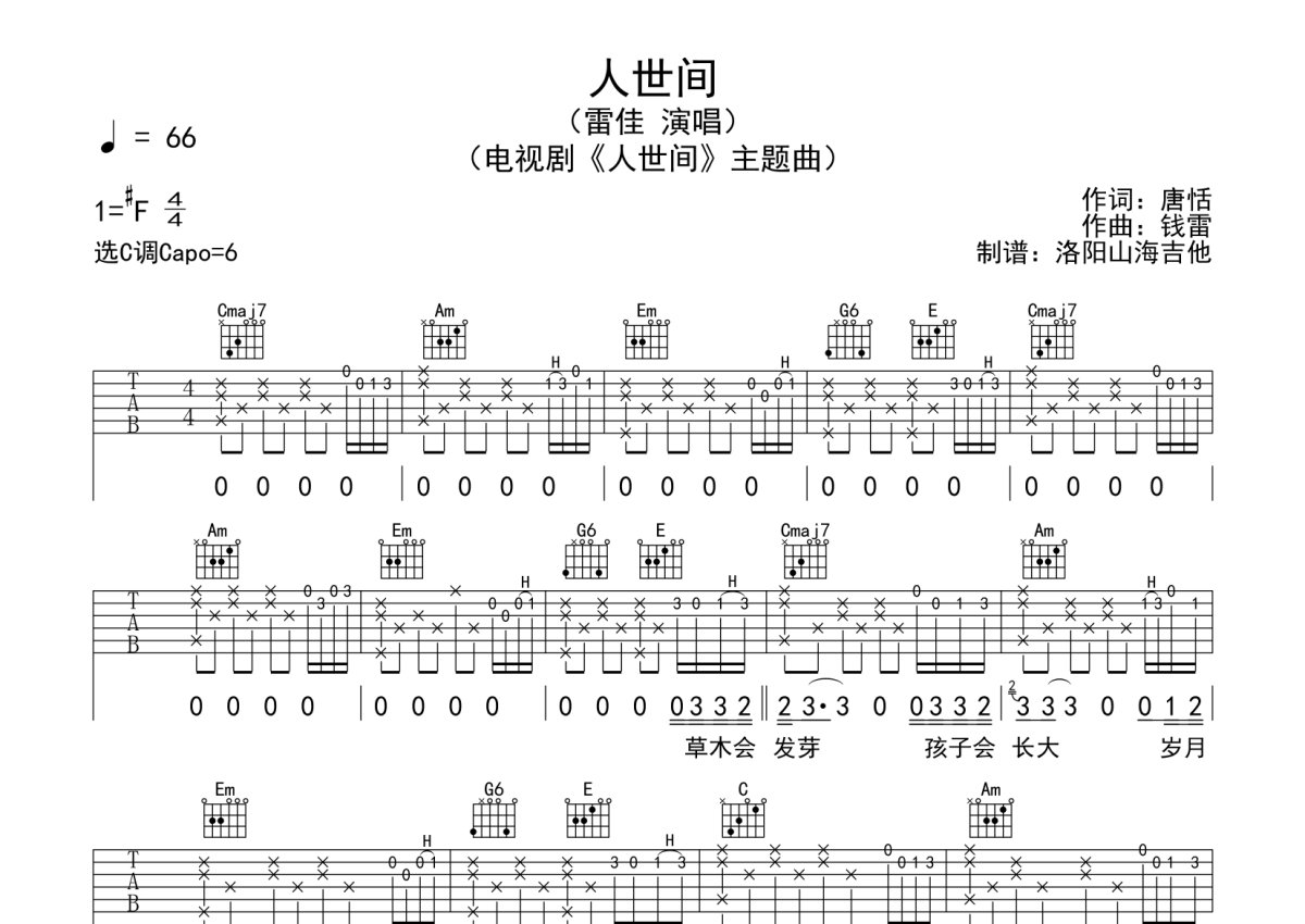 雷佳《人世间》吉他谱 - C调弹唱六线谱
