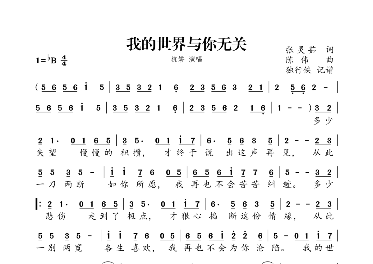 《我的世界与你无关》是杭娇演唱的一首歌曲,拍号为4/4拍,这份简谱共有一张高清图谱,图谱由 @独行侠 编配上传。
