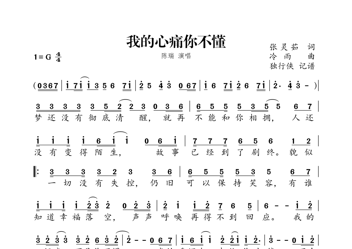 《我的心痛你不懂》是陈瑞演唱的一首歌曲,拍号为4/4拍,这份简谱共有一张高清图谱,图谱由 @独行侠 编配上传。