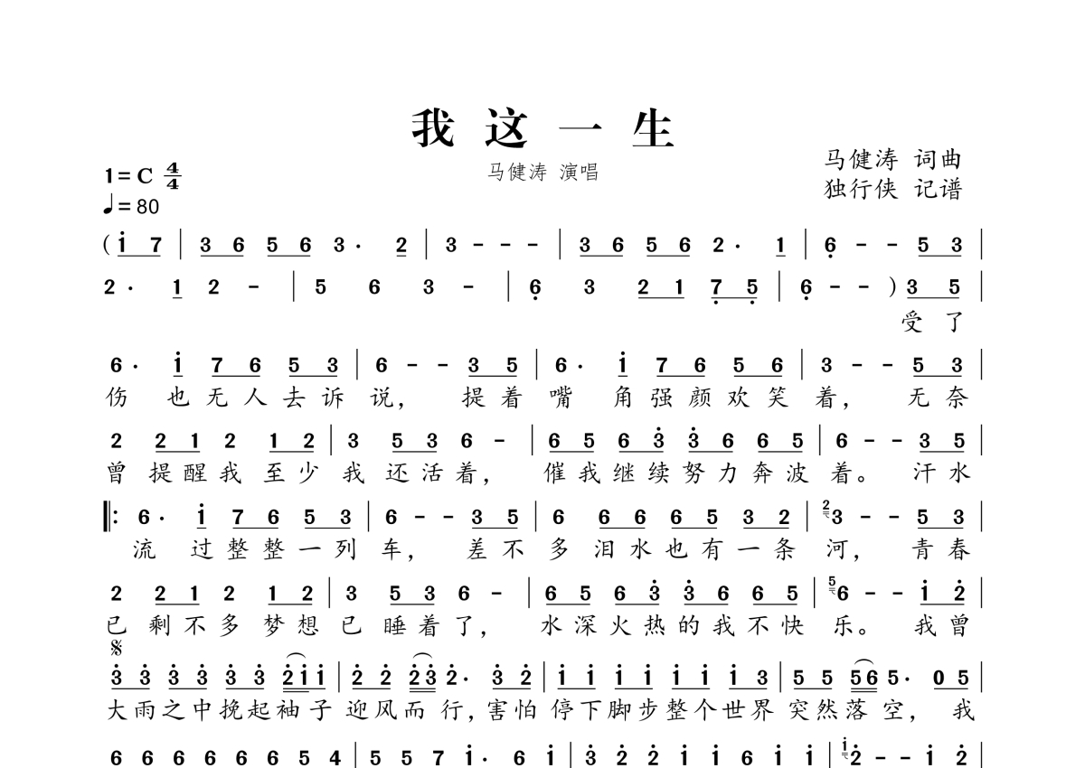 马健涛《我这一生》简谱