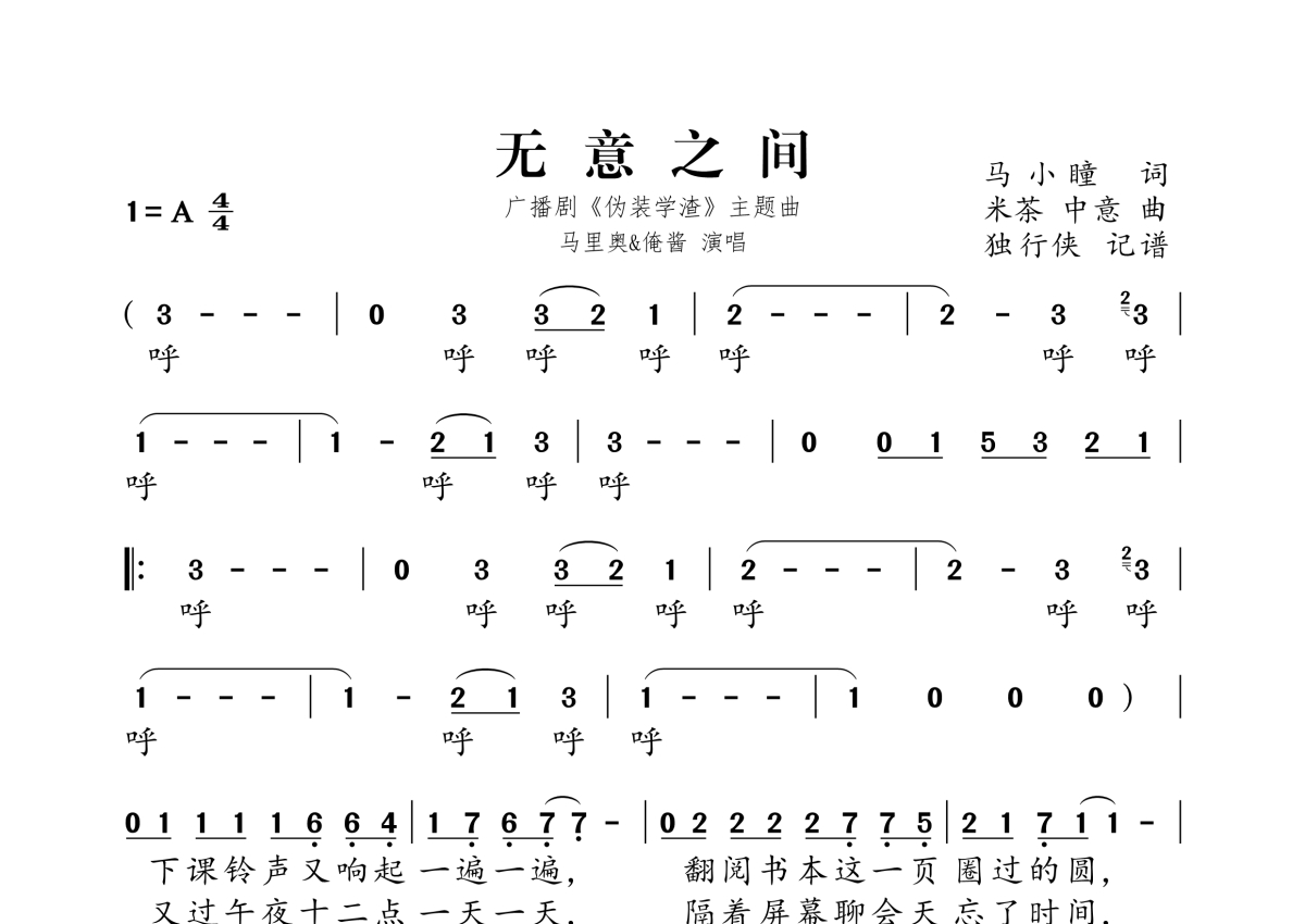 《无意之间》是马里奥&俺酱演唱的一首歌曲,拍号为4/4拍,这份简谱共有两张高清图谱,图谱由 @独行侠 编配上传。