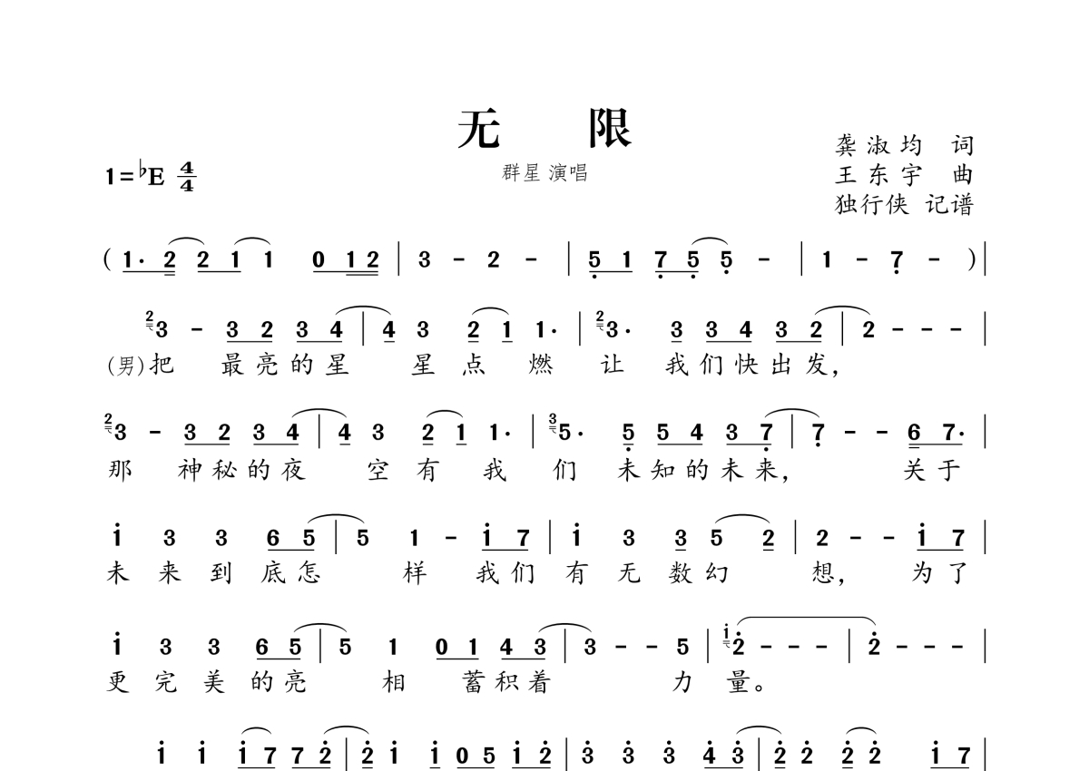 《无限》是群星演唱的一首歌曲,拍号为4/4拍,这份简谱共有一张高清图谱,图谱由 @独行侠 编配上传。