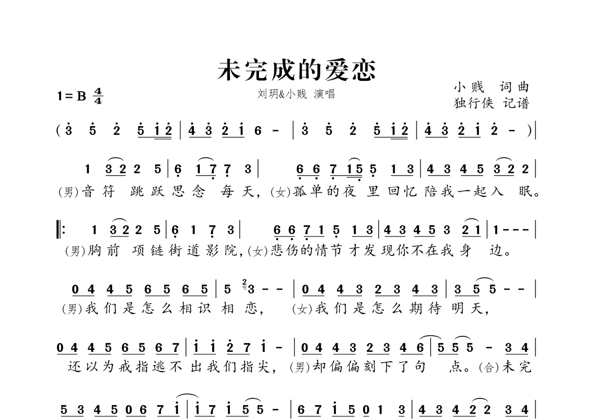 《未完成的爱恋》是小贱&Moe刘玥演唱的一首歌曲,拍号为4/4拍,这份简谱共有一张高清图谱,图谱由 @独行侠 编配上传。