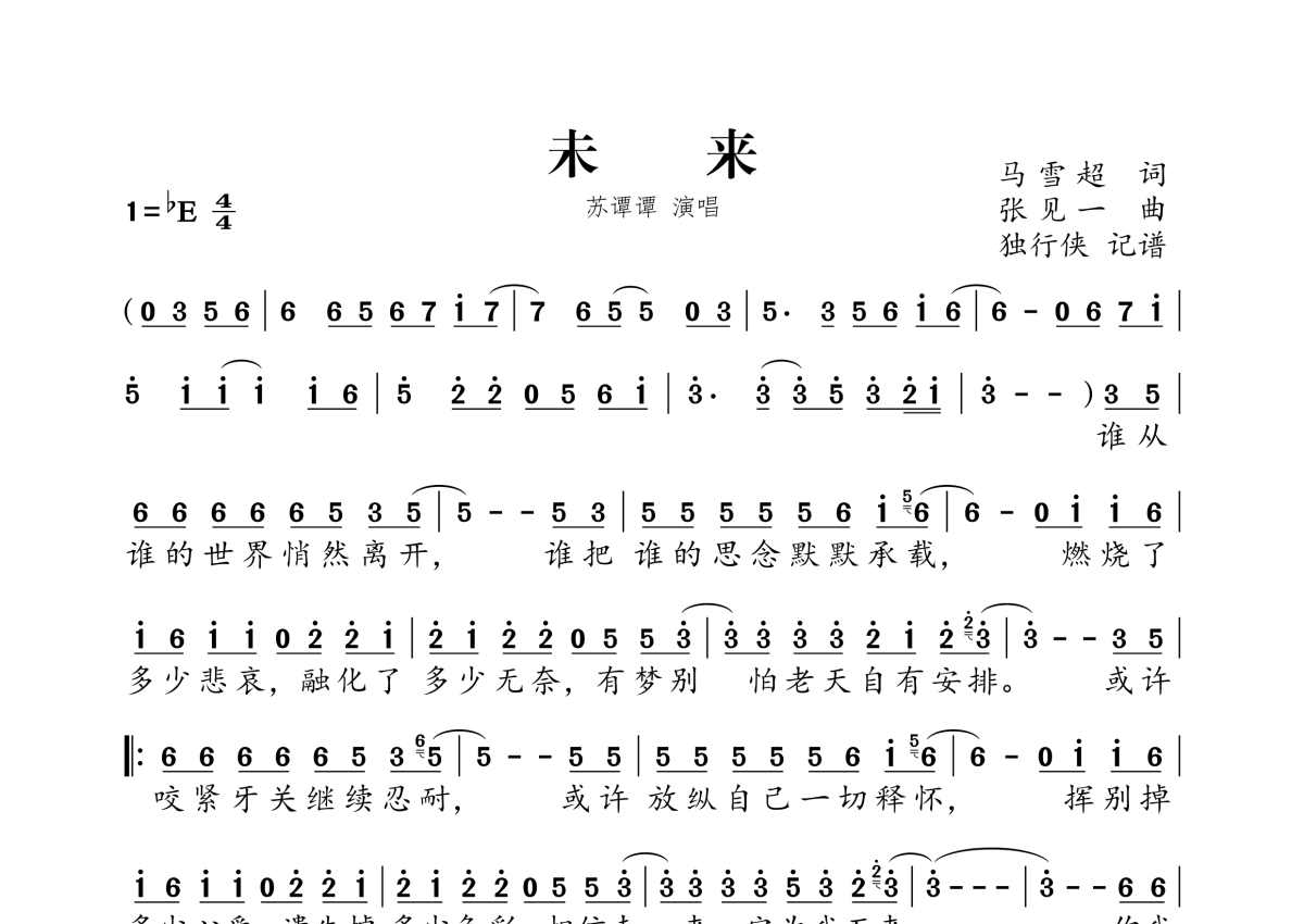 《未来》是苏谭谭演唱的一首歌曲,拍号为4/4拍,这份简谱共有一张高清图谱,图谱由 @独行侠 编配上传。