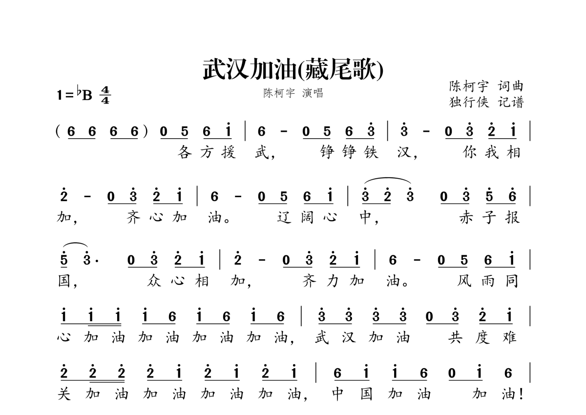 陈柯宇《武汉加油》简谱 - 藏尾歌