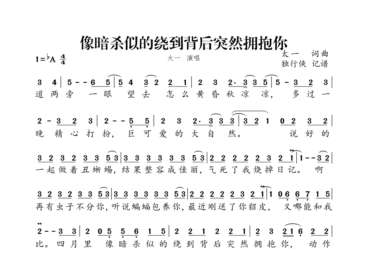 《像暗杀似的绕到背后突然拥抱你》是太一演唱的一首歌曲,拍号为4/4拍,这份简谱共有两张高清图谱,图谱由 @独行侠 编配上传。