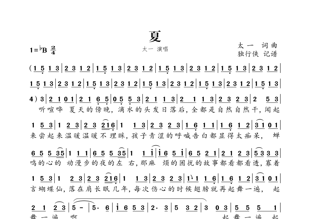 《夏》是太一演唱的一首歌曲,拍号为2/4拍,这份简谱共有两张高清图谱,图谱由 @独行侠 编配上传。