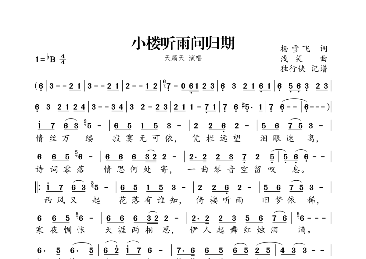 《小楼听雨问归期》是天籁天演唱的一首歌曲,拍号为4/4拍,这份简谱共有一张高清图谱,图谱由 @独行侠 编配上传。