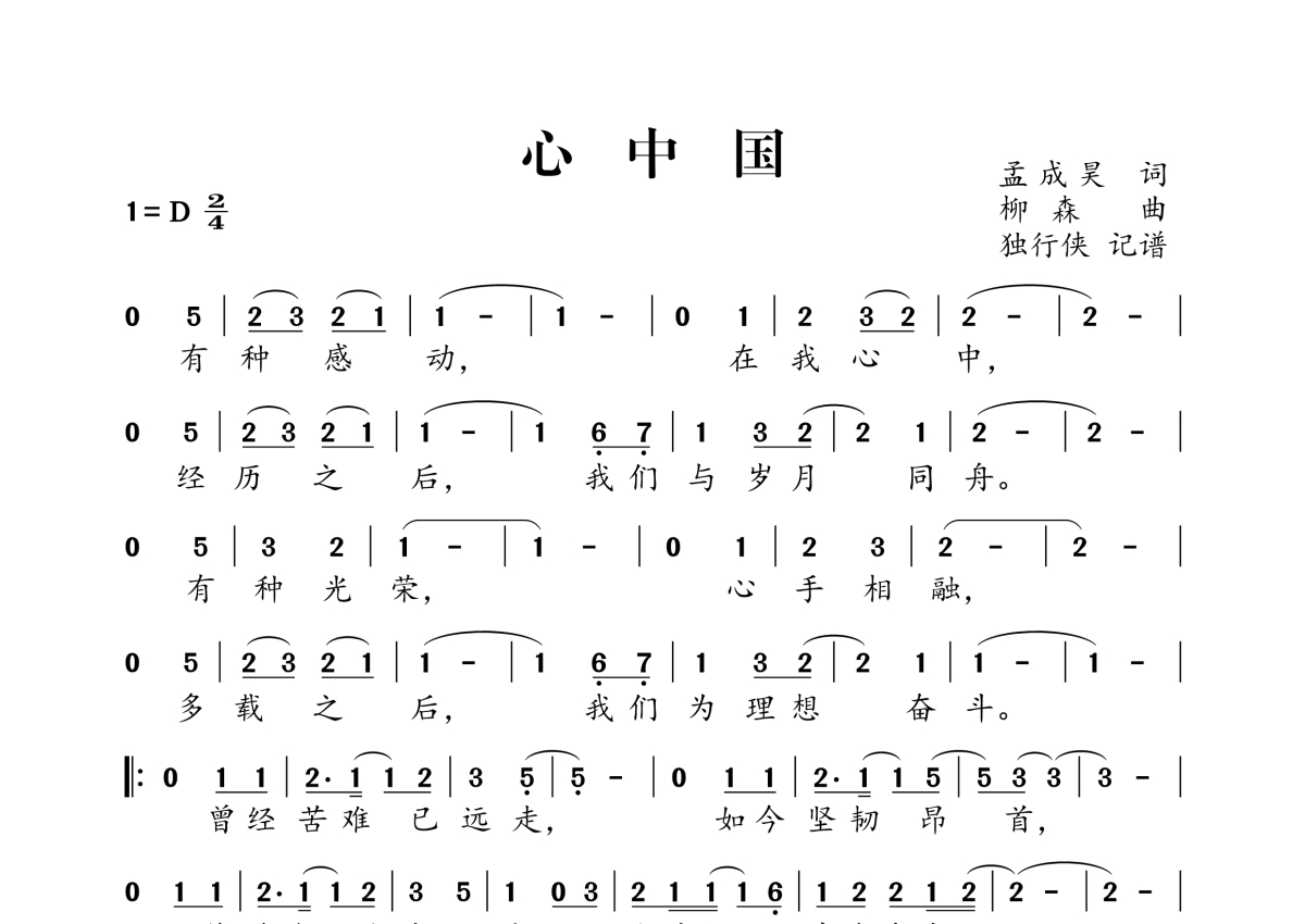 《心中国》,拍号为2/4拍,这份简谱共有一张高清图谱,图谱由 @独行侠 编配上传。